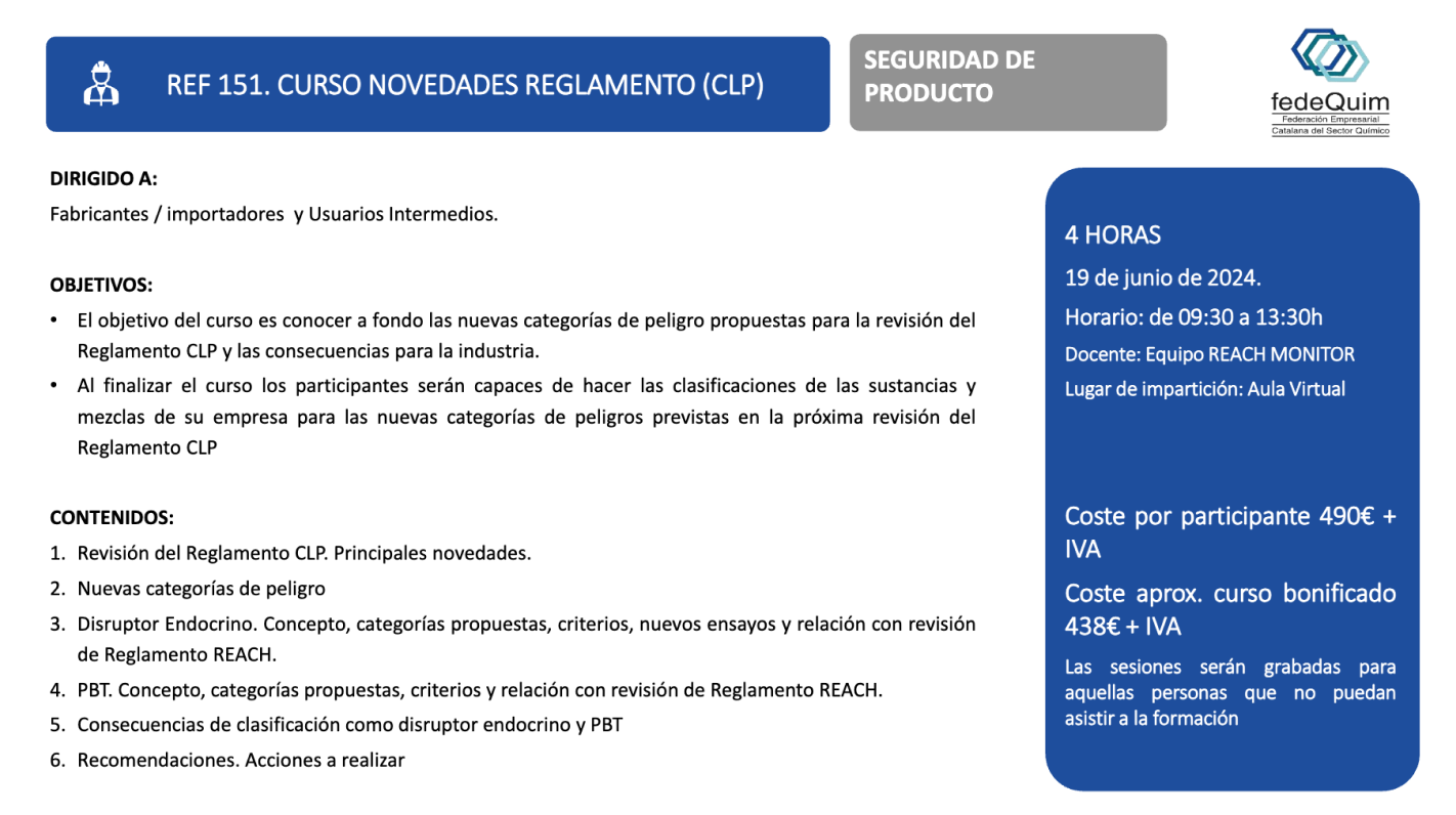 El objetivo del curso es conocer a fondo las nuevas categorías de peligro propuestas para la revisión del reglamento CLP y las consecuencias para la industria.